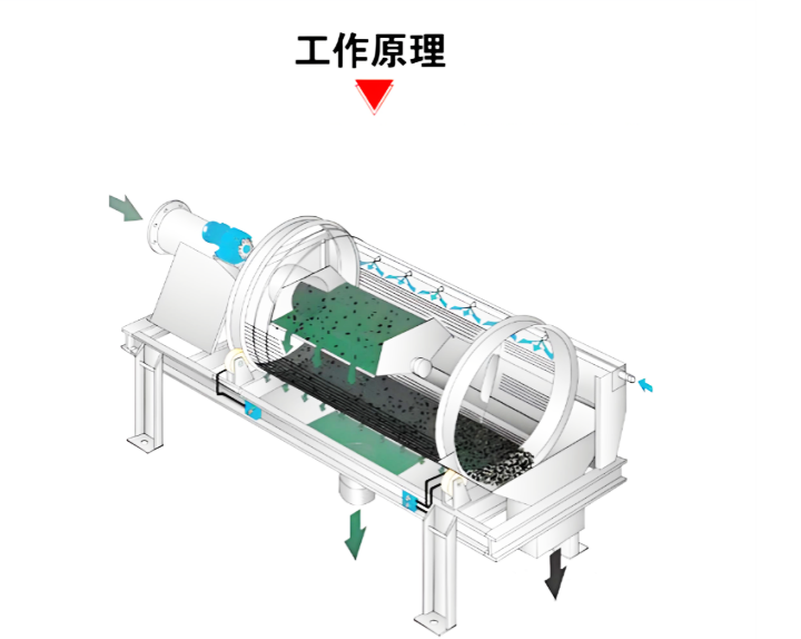 由電機帶動滾筒緩慢旋轉,石英砂從進料口進入滾筒后,在滾筒轉動和內置導料板的作用下不斷翻滾、拋撒。小于篩孔尺寸的砂粒透過篩網落入下方出料口,較大顆粒或雜質則沿滾筒末端排出,實現石英砂的粒徑分級與除雜。